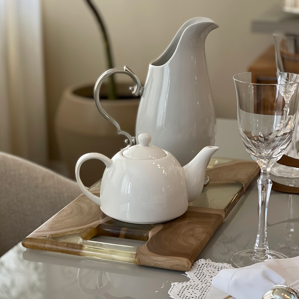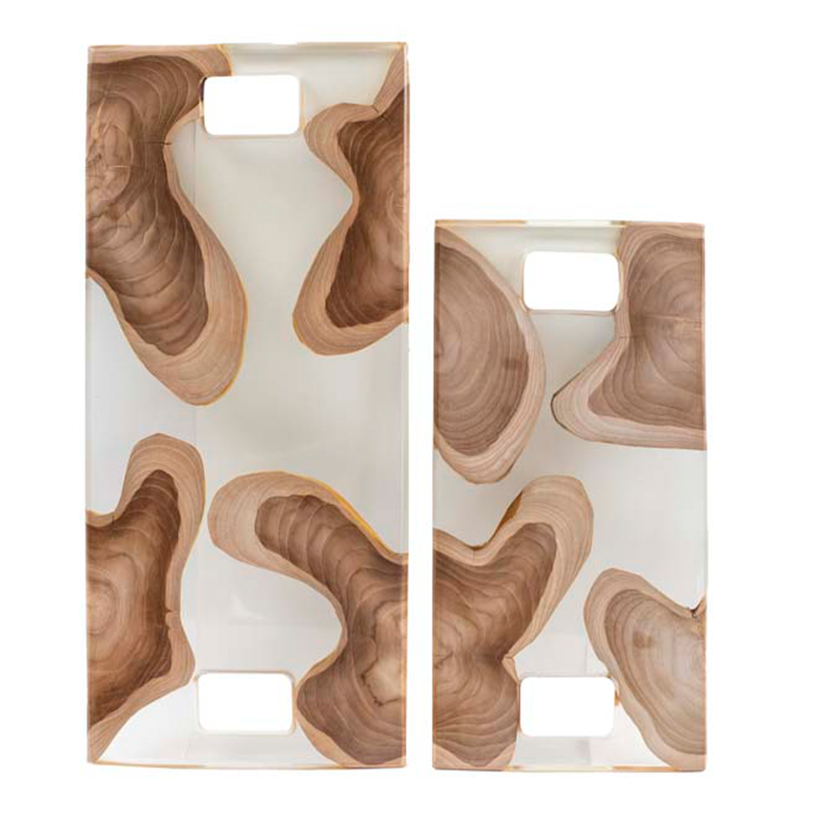 Bandeja grande feita em madeira teca e resina transparente (63 cm x 28 cm x 2 cm). Uma peça versátil e refinada, que combina funcionalidade com design excepcional.