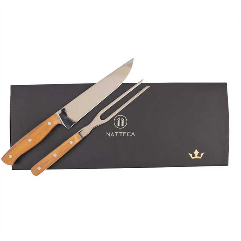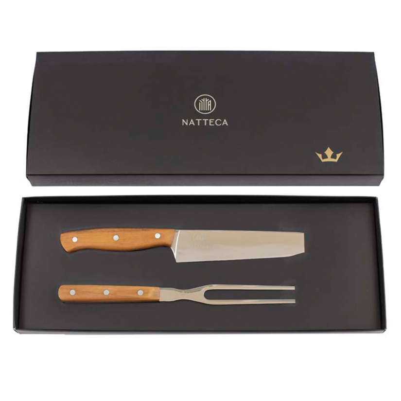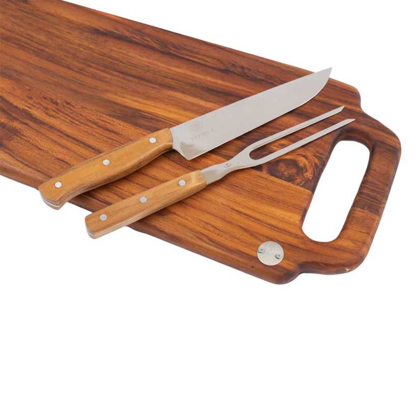 Kit para corte de carnes, desenvolvido em madeira teca e lâmina em aço carbono.